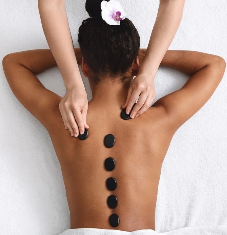 Deje que el calor de las piedras calientes calme cada fibra de su cuerpo, relajando profundamente sus músculos. Su toque suave libera tensiones y lo envuelve en una sensación de relajación total.